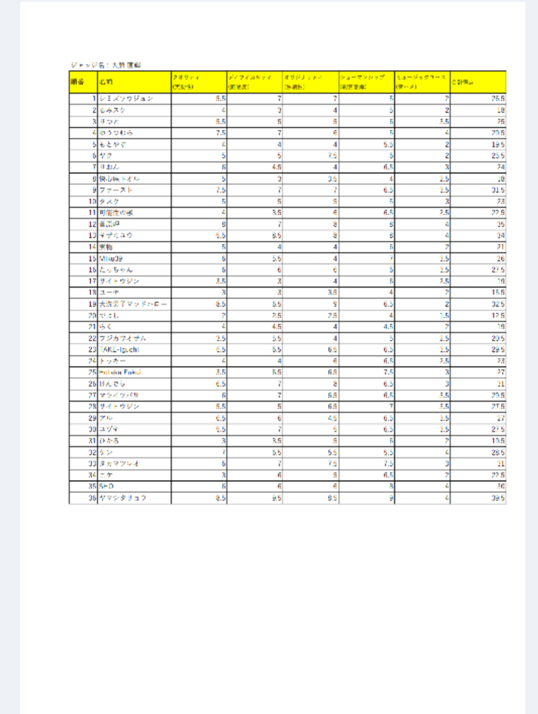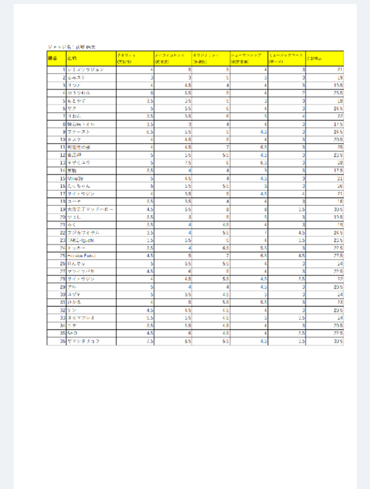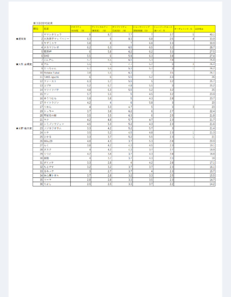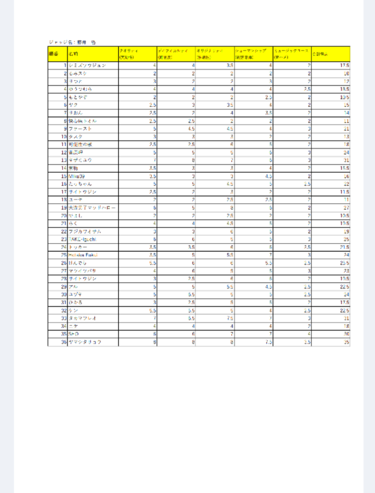 ※オーディエンス点は会場アンケートを実施し、獲得票数上位5名に上から5、4、3、2、1点を加点する。